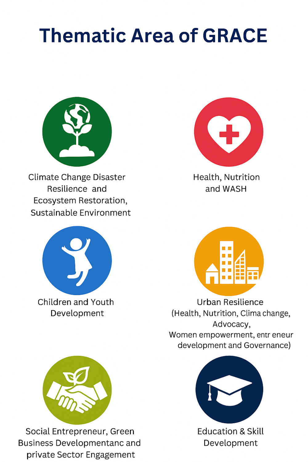 GRACE is committed to working in six thematic areas: Social Entrepreneurship, Green Business, and Private Sector Engagement – Supporting innovative livelihoods, promoting eco-friendly business practices, and fostering partnerships with the private sector to drive sustainable community development. Climate Change, Disaster Management, and Environmental Protection – Building climate resilience, enhancing disaster preparedness, and promoting environmental conservation for sustainable ecosystems. Health, Nutrition, and WASH – Improving access to healthcare, promoting proper nutrition, and ensuring safe water, sanitation, and hygiene practices in communities. Urban Resilience (Health, Climate Change, Advocacy, Governance) – Strengthening urban communities through health interventions, climate adaptation, policy advocacy, and improved governance. Education & Skill Development – Providing quality education, vocational training, and skill-building opportunities to empower children, youth, and adults. Women Empowerment, Children in Development, and Youth Employment – Promoting gender equality, supporting child development, and creating employment and entrepreneurship opportunities for youth.
